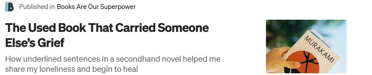 In the article, the author Shaant mentions that the previous owner of the book Norwegian Wood, by Haruki Murakami (*see footnote below*), had underlined passages and written personal reflections about loss and heartache on the sides of the pages. Shaant goes on to mention her experience of reading the secondhand book with its extras, like stepping into a quiet conversation across time and space. In Shaant’s description of flipping through the marked pages, it seems as though they sparked a reflection that grief, loneliness, and longing don’t exist in isolation.